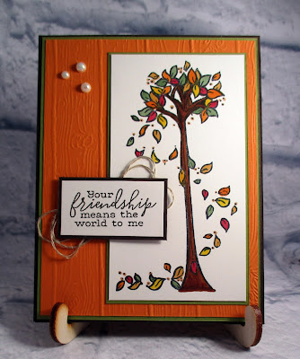 I have a few fall stamps--and many are still wood mounted. This is a fun stamp by Whipper Snapper Designs called Fall Tree. I colored the image with my Copic Sketch Markers. I found a sweet sentiment in the Stampin' Up Free As a Bird stamp set and inked that up with Early Espresso. I put some linen thread behind the sentiment. The background is embossed with Stampin' Up's Pinewood Planks folder and and I added some of my new Studio Katia Vintage Shimmer Pearls as an embellishment. I love the sparkle of these!