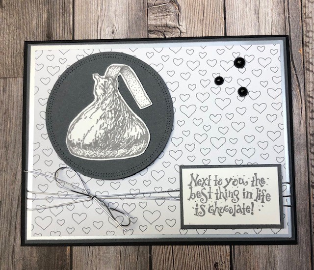 I picked the Wood theme and chose my Stampin' Up Pinewood Planks Dynamic Embossing Folder. I then used Early Espresso ink and brayered it on the embossing folder before placing Early Espresso cardstock in it. I like the bit of dark color it added to the woodgrain. I then picked one of my favorite retired Stampin' Up stamps called Love is Kindness, stamped it with the same Early Espresso in on Very Vanilla cardstock and colored with my Copic Sketch markers. I think Woodstock was all about Kindness and Love--lots of love from what I heard....................... I also believe the flowers were a significant part of that time period. I added some linen thread behind the image and a few tan enamel dots as the added touches.